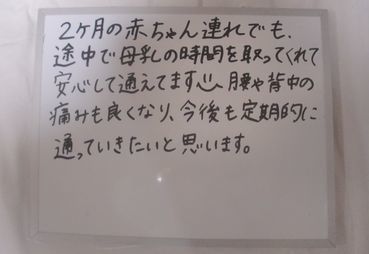 通院して2か月、初めの頃はとても腰が痛く、可愛い我が子を抱っこするのも苦痛になってしまっていました。今は腰も腰も順調!体重も落ち、笑顔で抱っこができます!!今後もこの調子をキープしたい!