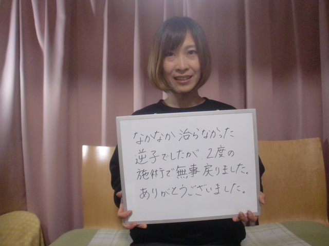 なかなか治らなかった逆子でしたが、2度の施術で無事戻りました。ありがとうございました。