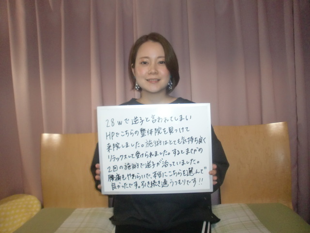 28Wで逆子と言われてしまいHPでこちらの整体院を見つけて来院しました。施術はとても気持ち良くリラックスして受けられました。するとまさかの2回の施術で逆子が治っていました。腰痛もやわらいで、本当にこちらを選んで良かったです。引き続き通うつもりです!!